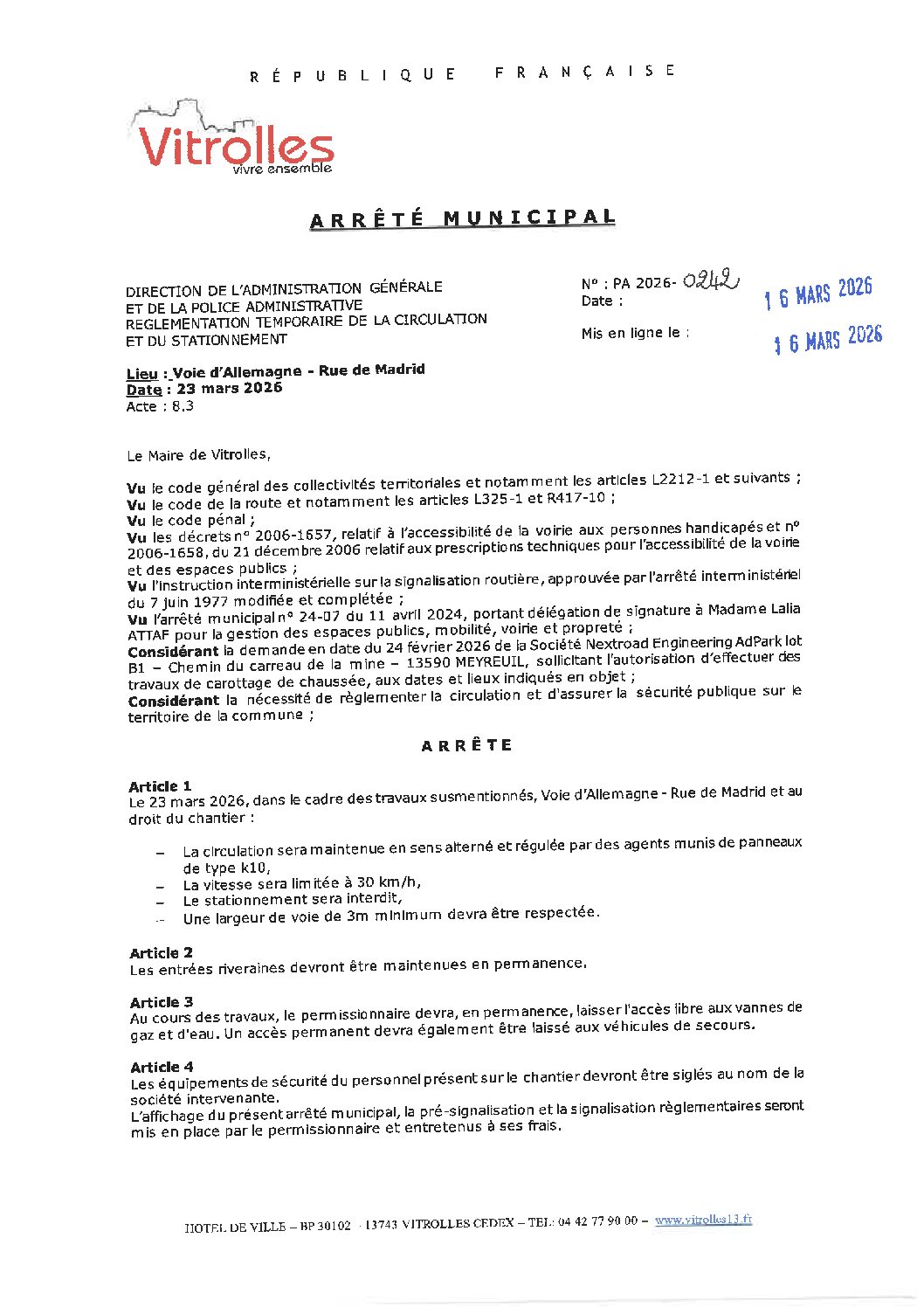 Règlementation temporaire de la circulation voie d'Allemagne et rue de Madrid