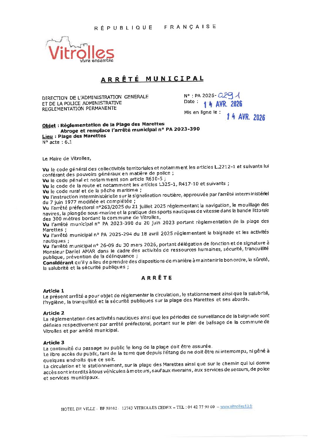 Arrêtés : PA2026-0291 Réglementation de la plage des Marettes