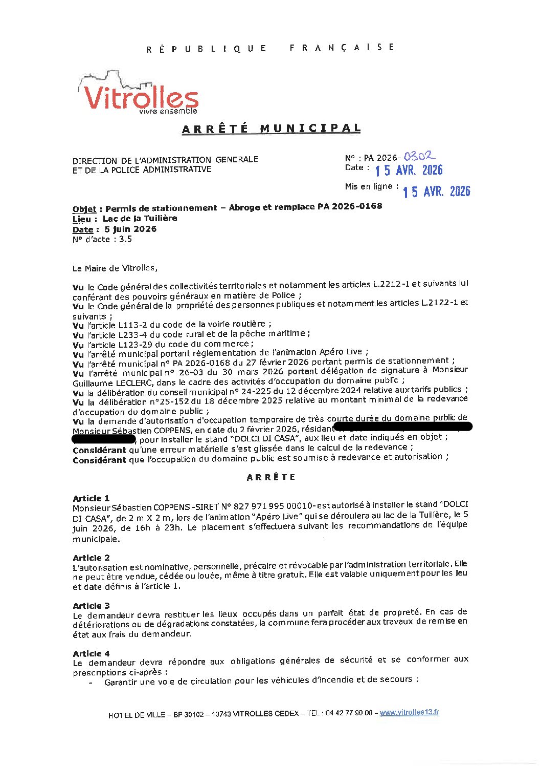 Arrêtés : PA2026-0302 DOLCE DI CASA Apéro Live – Lac de la Tuilière – 5 juin 2026