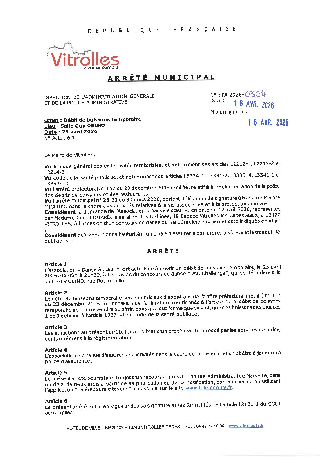 Débit de boisson pour l'Association DANSE A COEUR le 25/04/2026 pour un concours de dance à la salle Guy Obino