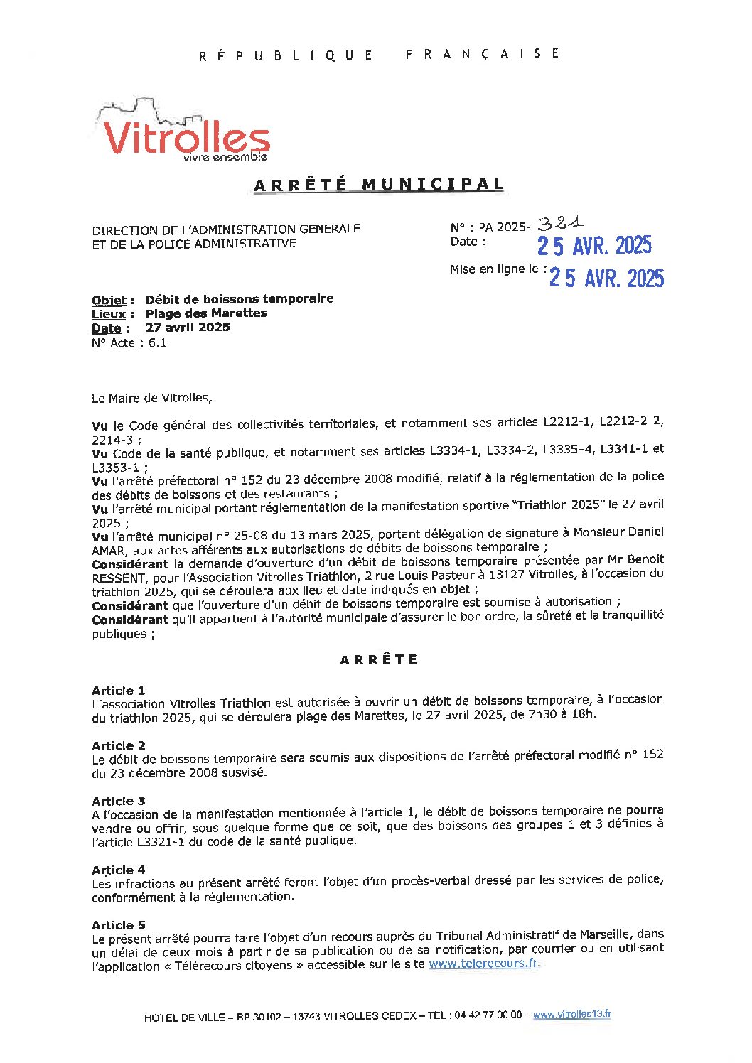 Arrêtés : PA_2025-321 DB Vitrolles triathlon – Plage des Marettes