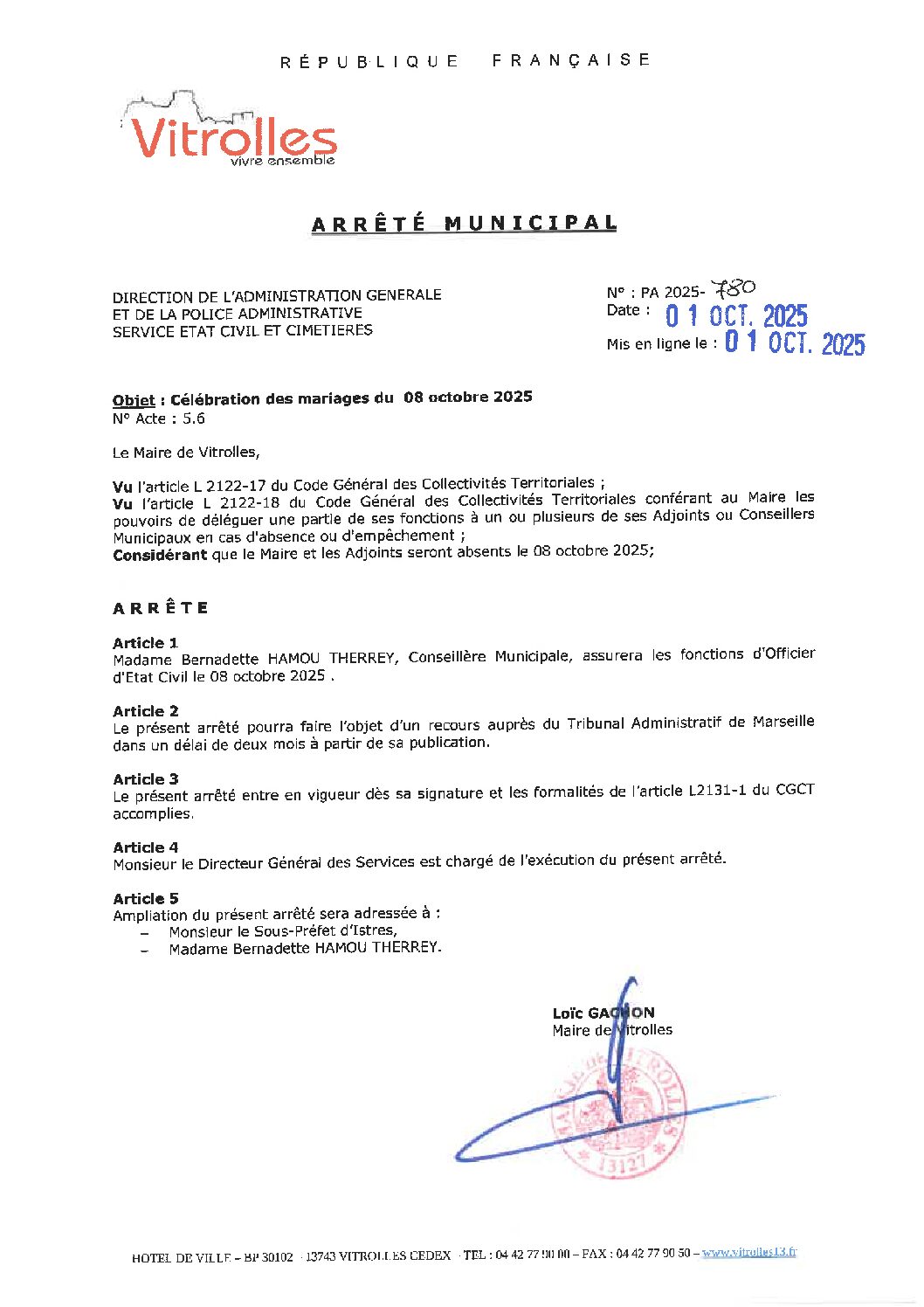Arrêtés : PA_2025-780 Célébration de mariages le 8 octobre – Commune de Vitrolles