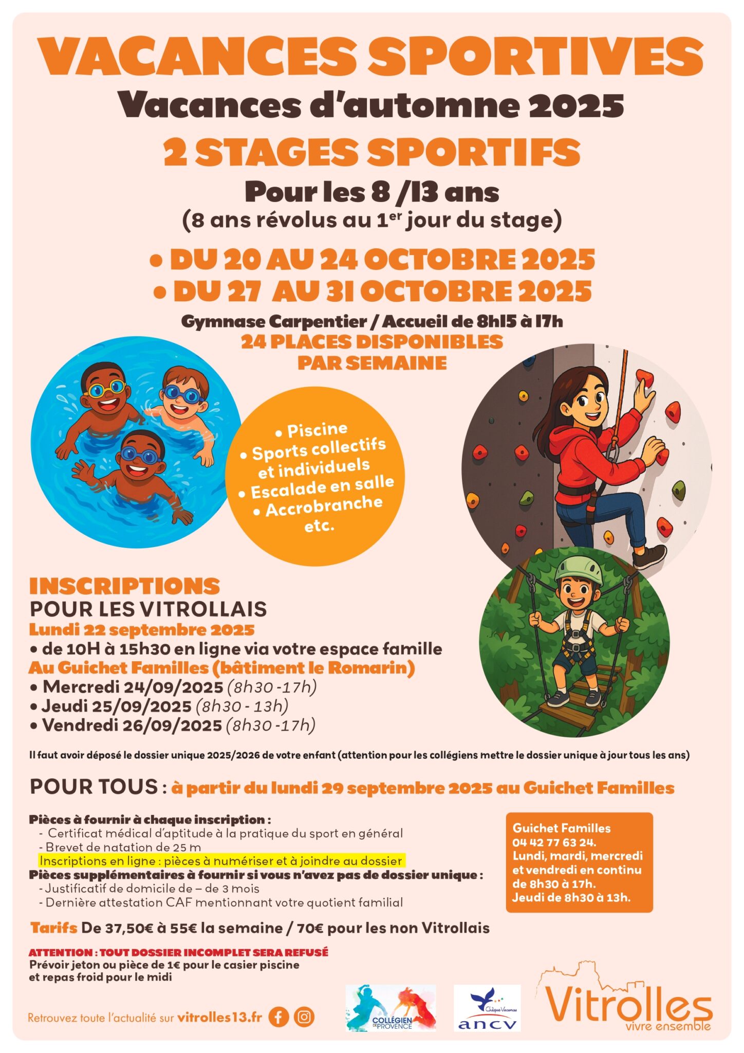 Les inscriptions s’effectuent auprès du Guichet Familles à des périodes bien définies. Les inscriptions pour les vacances sportives d’automne auront lieu à partir du 22 septembre 2025 de 10h à 15h30 en ligne via votre espace famille ( voir document ci-dessous).