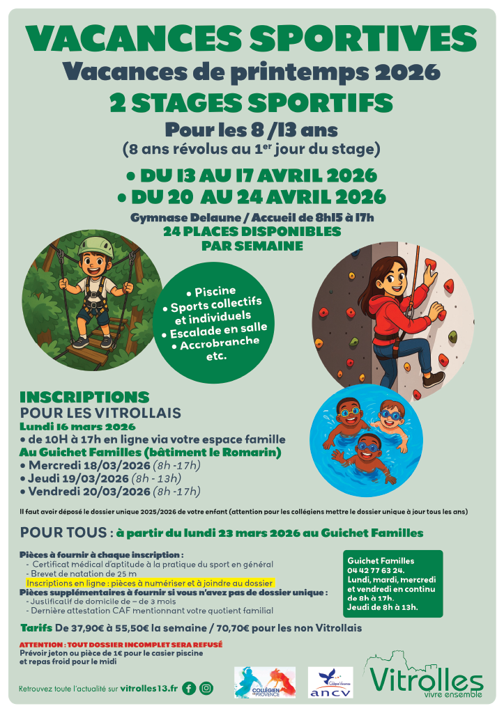 Les inscriptions s’effectuent auprès du Guichet Familles à des périodes bien définies. Les inscriptions pour les vacances sportives du printemps auront lieu à partir du 16 mars 2026 de 10h à 17h en ligne via votre espace famille ( voir document ci-dessous).