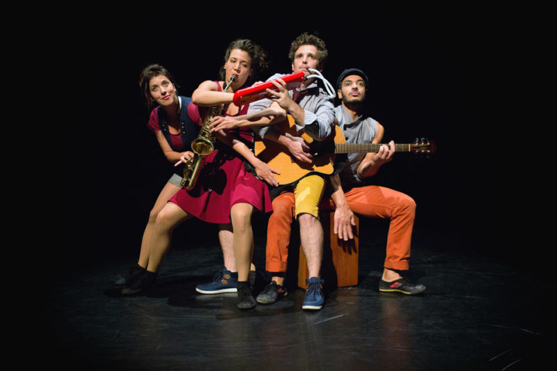 Quatre artistes sur scène, à la fois musiciens et acrobates, jouent de tout et s’amusent d’un rien.