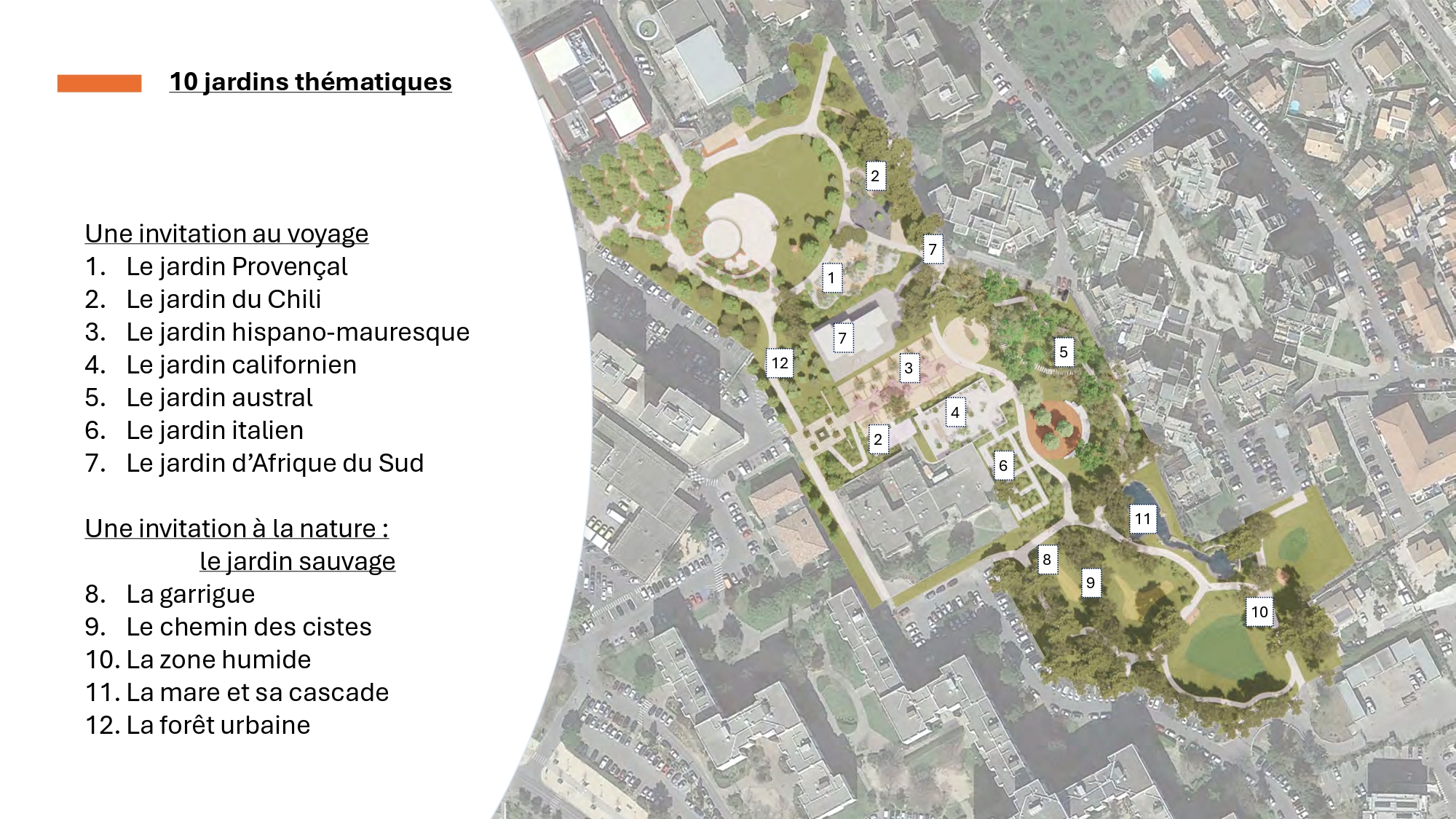 Le parc s’organisera également autour de plusieurs jardins thématiques, véritables invitations au voyage : jardin provençal, du Chili, hispano‑mauresque, californien, austral, italien et d’Afrique du Sud.